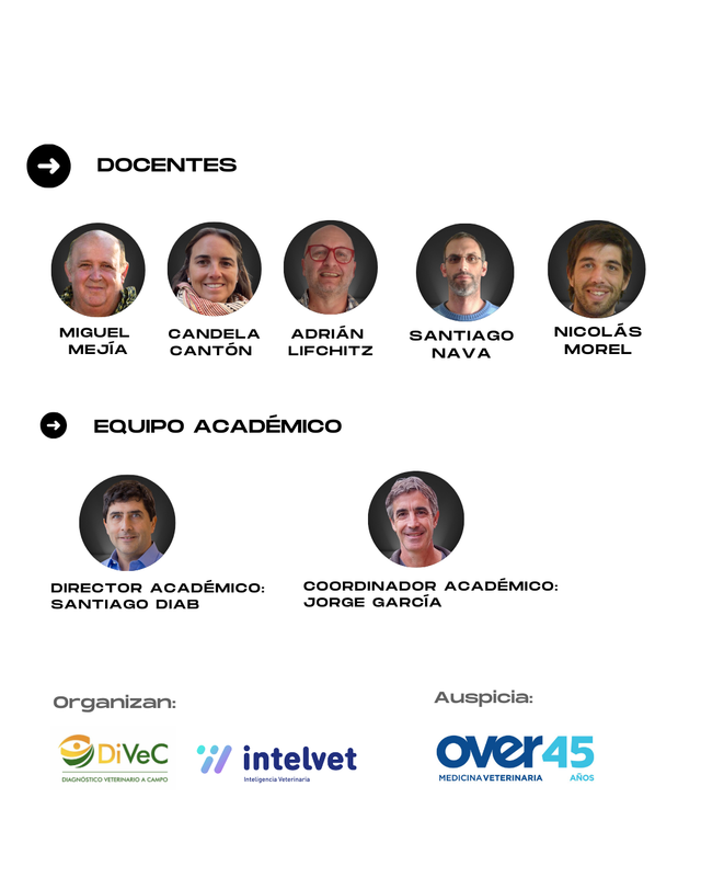 Director Académico: Santiago Diab. Médico Veterinario, Especialista en Salud Animal, Dip ACVP. Fundador de Diagnóstico Veterinario a Campo (DIVEC). Patólogo del Laboratorio Santa Rosa, La Pampa, Argentina. Profesor de la Facultad de Medicina Veterinaria de Virginia-Maryland, USA.