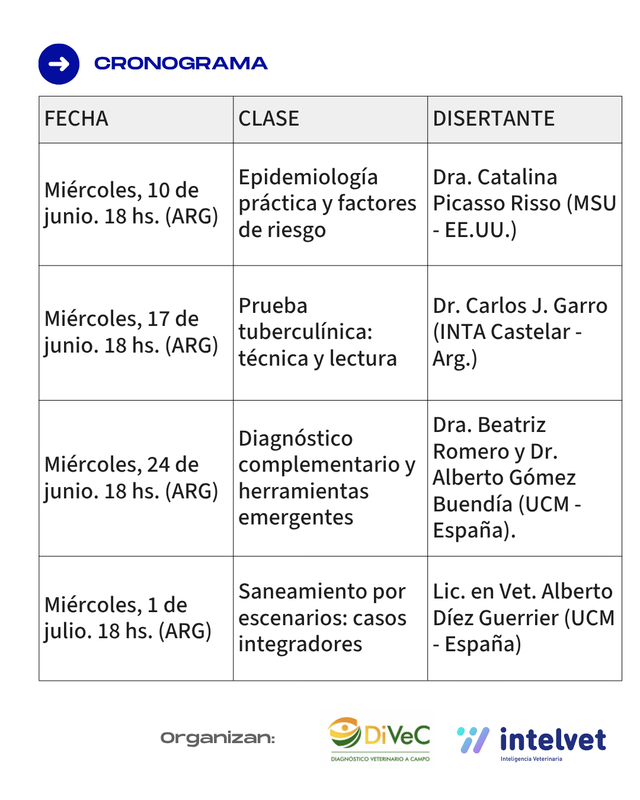 Esta capacitación ofrece al veterinario rural un abordaje integral sobre el control de la tuberculosis bovina, centrándose en la epidemiología práctica, la bioseguridad y el perfeccionamiento técnico de las pruebas de diagnóstico en campo. A lo largo de las clases, los participantes profundizarán en la identificación de factores de riesgo, la ejecución precisa de la prueba tuberculínica para evitar errores frecuentes, el uso de herramientas complementarias como ELISA y Gamma interferón, y el diseño de estrategias de saneamiento personalizadas según el sistema productivo (carne o leche) y la prevalencia del rodeo.